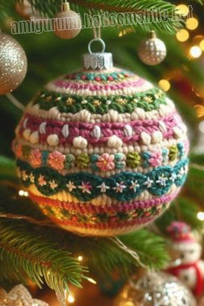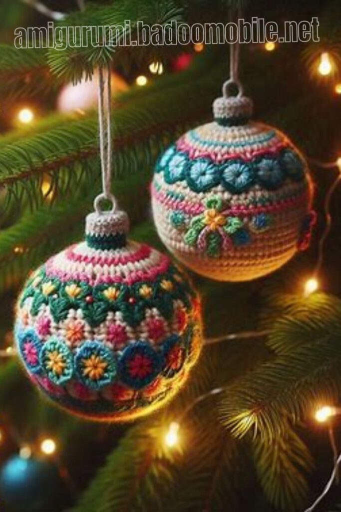 The baubles are worked in different colour combinations. Each bauble is worked in the round, from the centre outwards and in 2 halves. The halves are sewn together and filled with wadding. The loop is worked to finish.