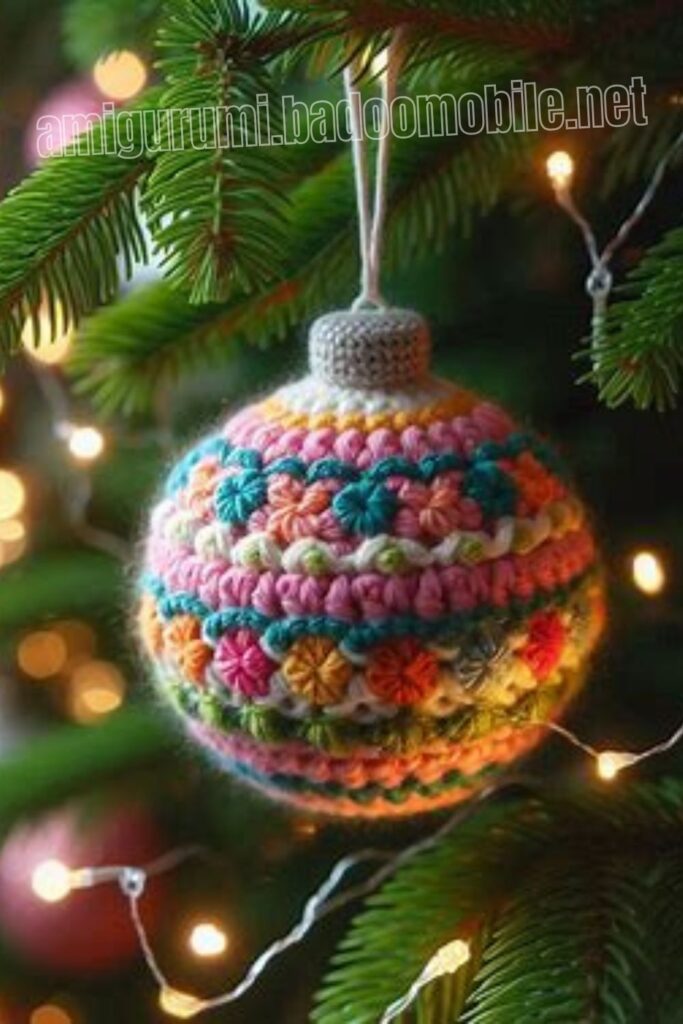 Work 1 slip stitch in the top of the bauble, using the same colour as the final round on the bauble, work 20 chain stitches and fasten with 1 slip stitch in the top of the bauble. Cut and fasten the strand.