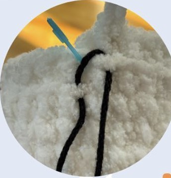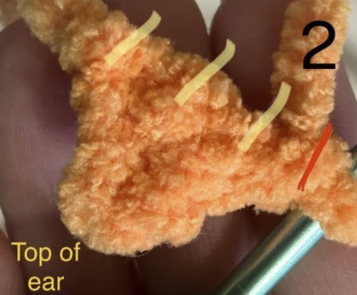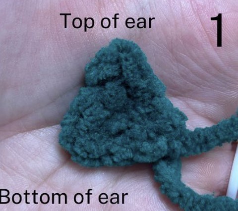 • Attach the ears between R2&4 about 2 sc back from the eyes. Embroider the nose between R5&6.