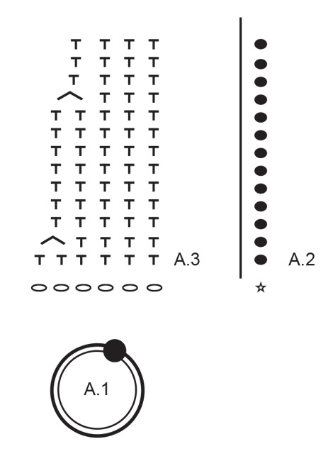 Crochet a chain stitch ring as explained in diagram A.1. Crochet A.2 (= beginning and end of the round), crochet A.3 a total of 6 times around the chain stitch ring. After 1st round in A.2/A.3 switch to colour red / olive / dark ivy (= colour of the hat itself) and continue with this colour. Remember to follow the crochet tension.