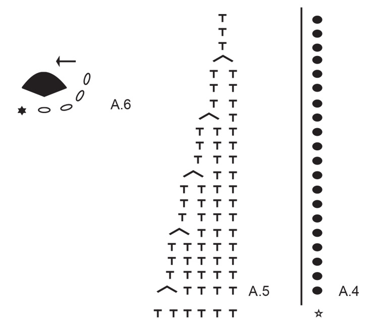 When A.2 and A.3 are worked in height, there are 24 double crochets + 1 chain stitch on the round. Now work as follows: Crochet A.4 (beginning and end of the round), crochet A.5 a total of 4 times in the round. Continue like this. When A.4 and A.5 are done in height, there are 4 double crochets + 1 chain stitch on the round.