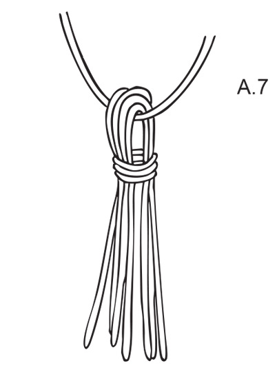 See diagram A.7 and cut 12 strands with a length of 10 cm in colour off white. Cut 1 strand of 20 cm in colour off white to fasten the tassel. Place this strand over the other strands. Place strand of 10 cm double and tie a new strand in colour off white around the top of tassel (approx. 0.5 cm from fold). Fasten strand tightly and the fasten the tassel at the top of hat. Cut tassel to desired length.