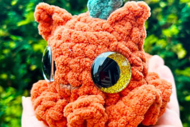 • FO, leaving a tail. Insert both tails into the top of the pumpkin and out at the same stitch on the head. Double knot the two ends together and hide the knot in the head of the cow.
