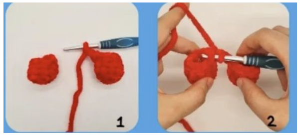 R1: ch 4 (the first ch doesn’t count as a st) in the 2nd ch from the hook make sl st, sc, sc in the next st of the body, (3ch, sl st, sc, sc in the body)x3 (3ch, sl st, sc, cc to black sc in the body. Continue this way following the body’s color sts.