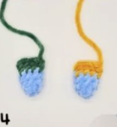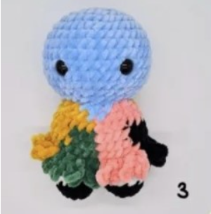 R13: with black 2sc, cc to yellow 3sc, cc to pink dec, 3sc, cc to light blue sc, dec, sc, cc to yellow 3sc, dec, cc to pink 3sc, cc to black sc (20)