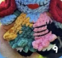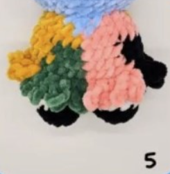 R9: cc to green 5sc, cc to black 6sc, cc to pink 4sc, cc to green 3sc, cc to yellow 10sc (28)