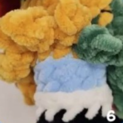 R10: cc to green 5sc, cc to black 6sc, cc to pink 4sc, cc to green 3sc, cc to yellow 8sc, cc to green 2sc (28)