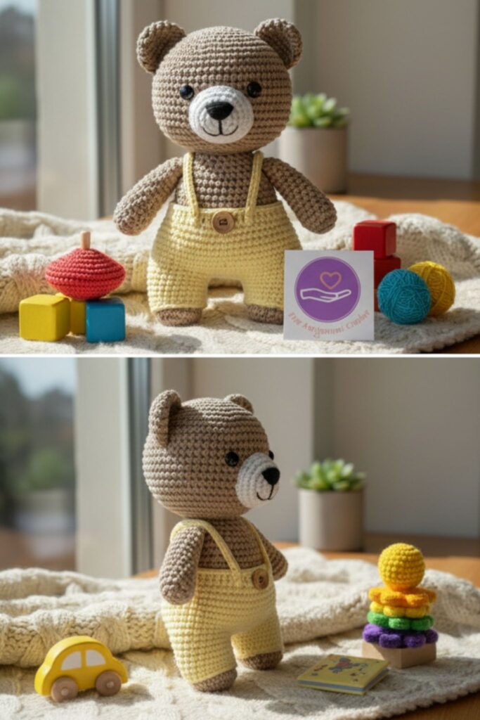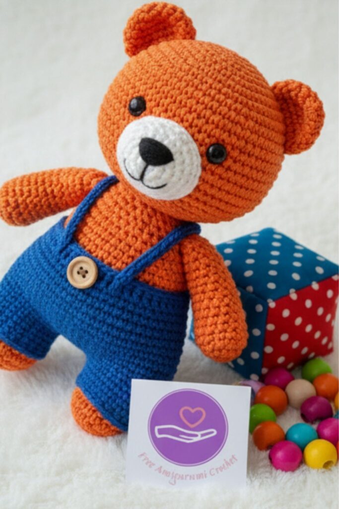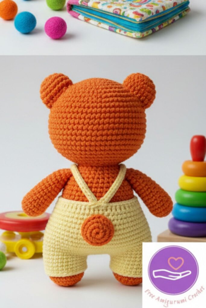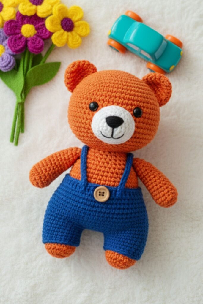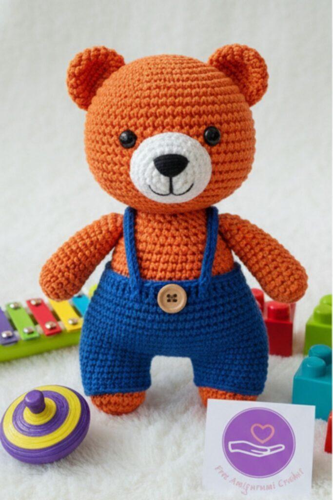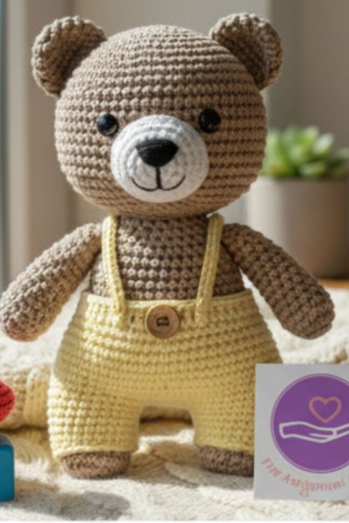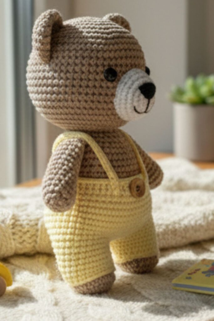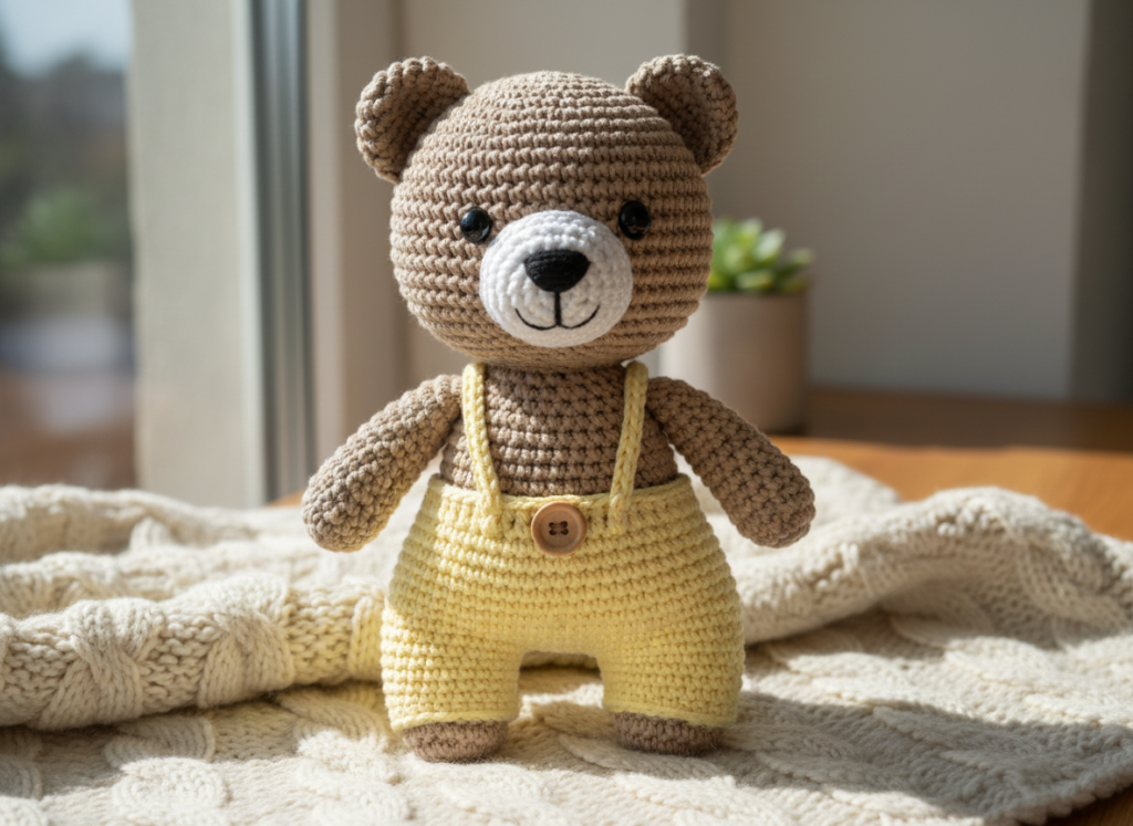 This cute teddy bear wearing non-removable pants is crocheted mostly in one piece, making it sturdy, beginner-friendly, and perfect as a handmade gift or nursery decor.