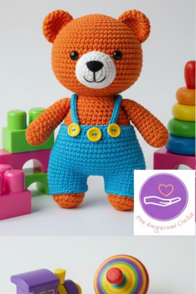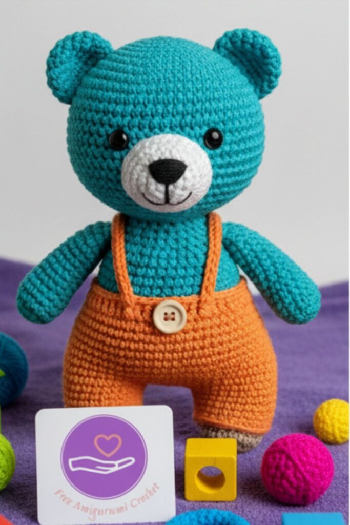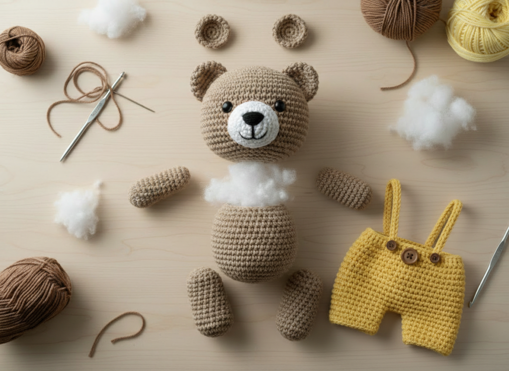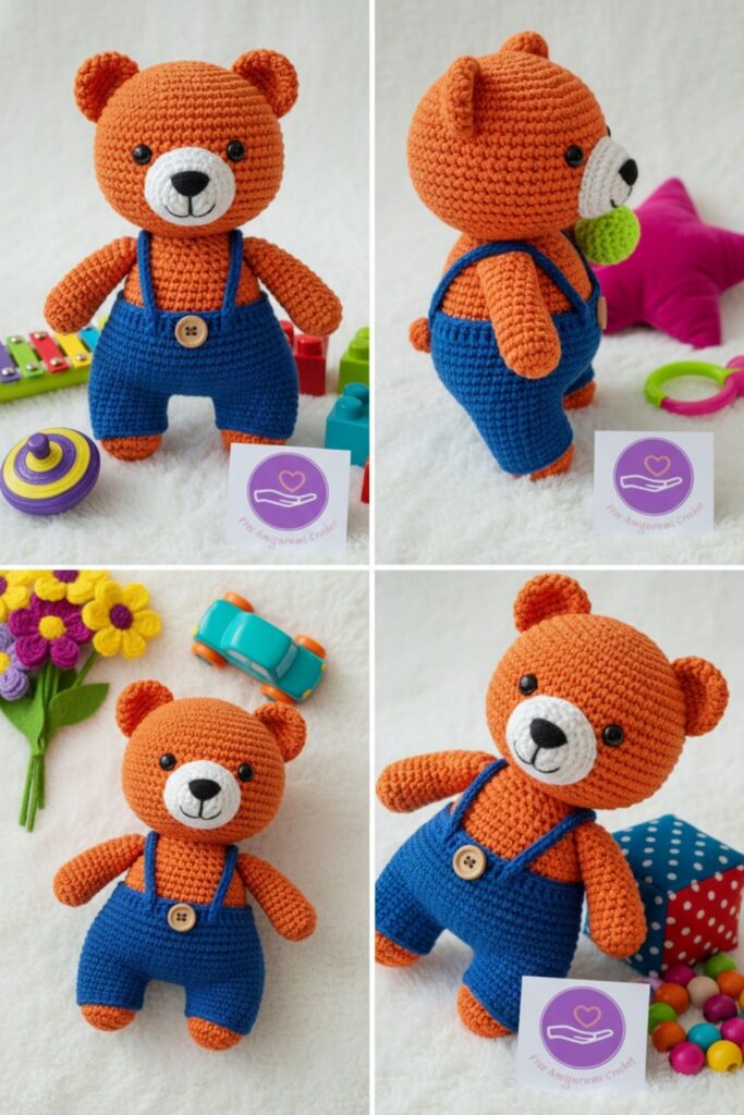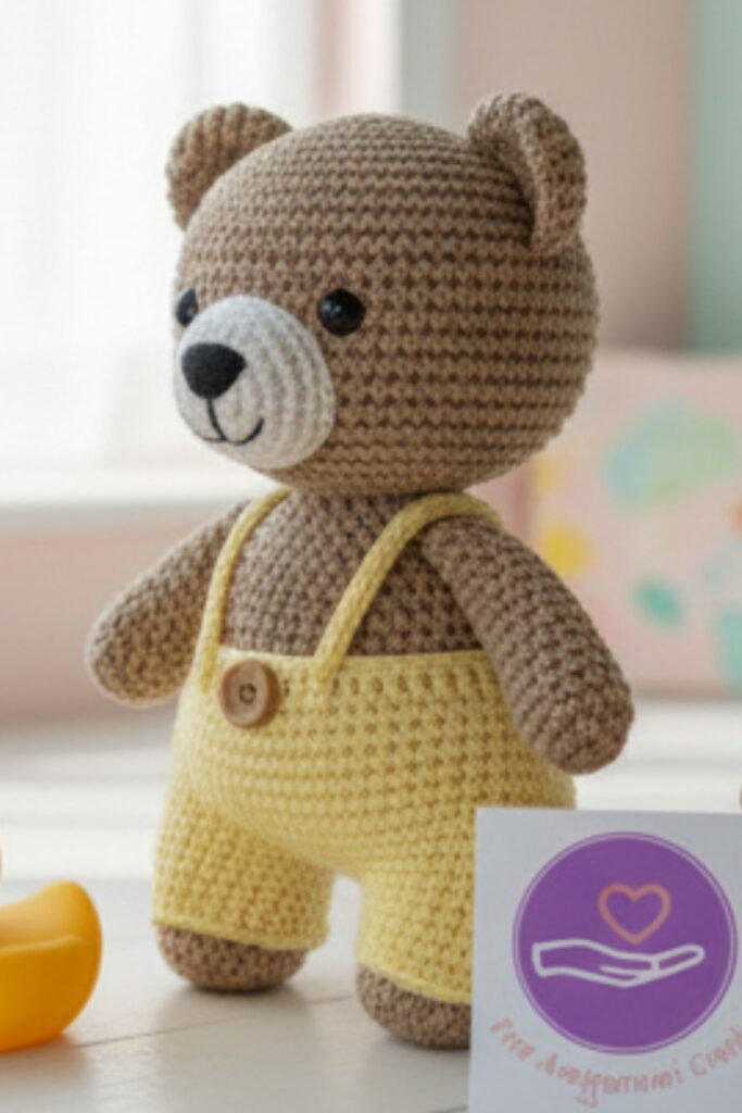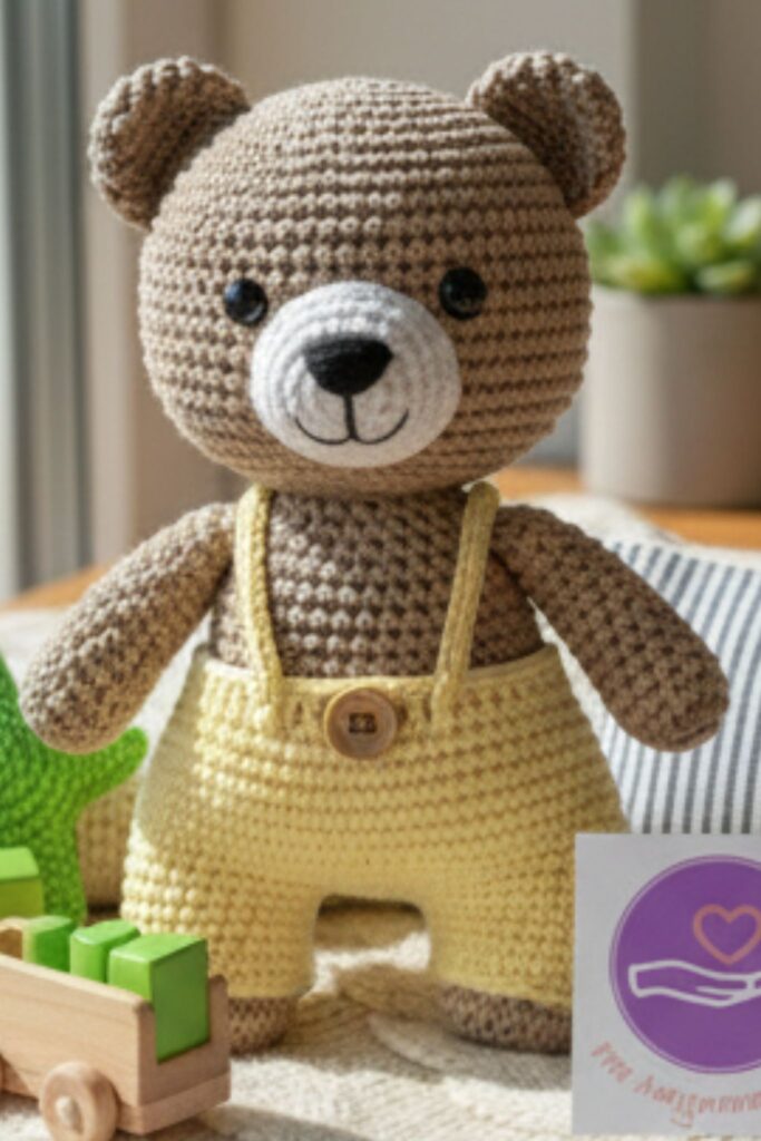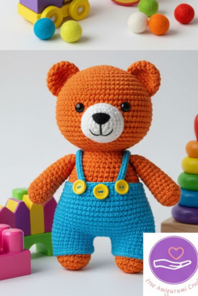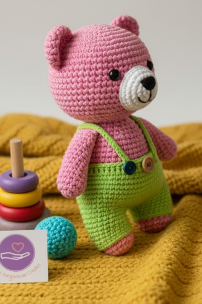 This cute teddy bear wearing non-removable pants is crocheted mostly in one piece, making it sturdy, beginner-friendly, and perfect as a handmade gift or nursery decor.